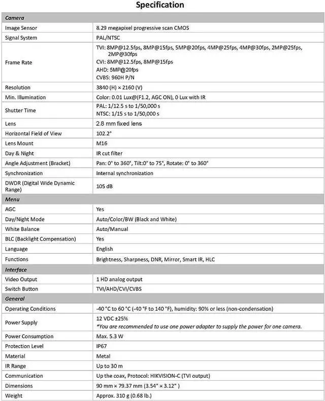 2.8mm fixed lens, IP67 Rated for Outdoor Use, 30 meters IR distance.