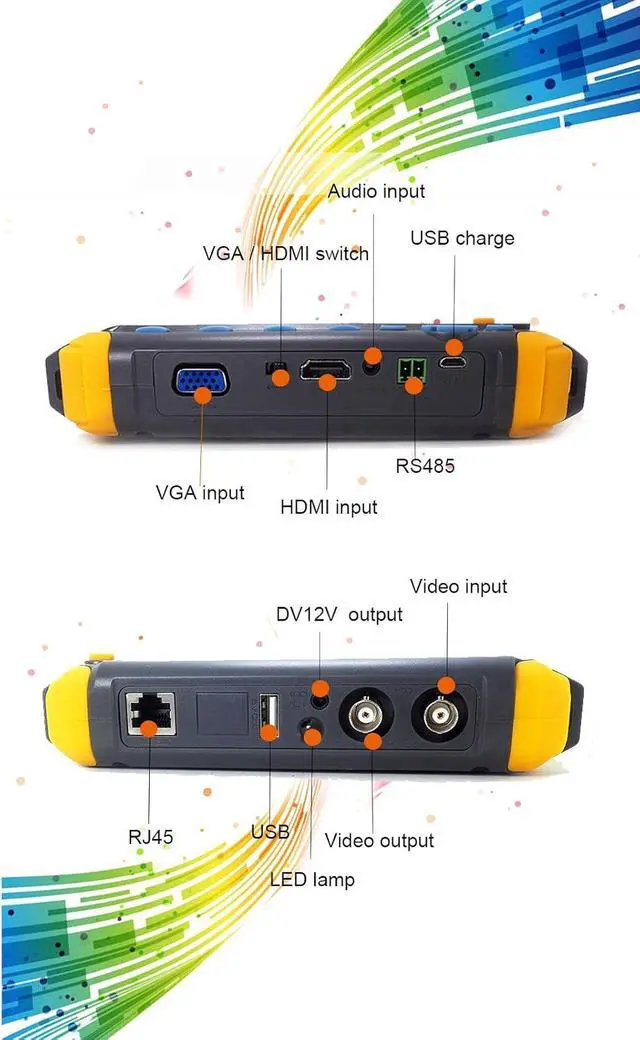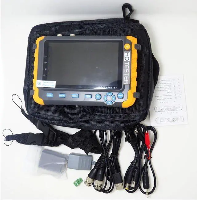Video signal testing PTZ controller Image generator: Multi-format video OUT port image generator, sending a variety of standard (e.g. PAL, NTSC) color graphics section DC12V 1A output power Audio testing: Test the audio input from pickup devices. Connect the tester and pickup device with the audio cable. Enhanced network cable testing: By UTP CABLE TEST port on the meter, you can test the connection of network cable. VGA/HDMI input: support VGA/HDMI 1.0 video input, once connect VGA/HDMI video, please switch selector to select HDMI or VGA mode. The maximum resolution is 1920 x 1440 TVI camera test: HD TVI video surveillance testing, support 1MP 2MP 3MP 4MP 5MP 8MP. When TVI signal input, the tester will display HD TVI camera image. AHD camera test: HD video surveillance testing, support AHD 2.0 version,1MP 2MP 3MP 4MP 5MP 8MP. When AHD signal input, the tester will display the AHD camera image. CVI camera test: HD CVI video surveillance testing, support 1MP 2MP 3MP 4MP 8MP. When CVI signal input, the tester will display HD CVI camera image. LED lamp: It is useful for the engineer to install and maintain security system at night. LED On/Off pressing button, easy to operate. The battery graphic display: The tester has advanced power control and protection circuit, low-power energy-saving, 4 to 5 hours on a single charge, can be used normally for 12 hours. Packing list