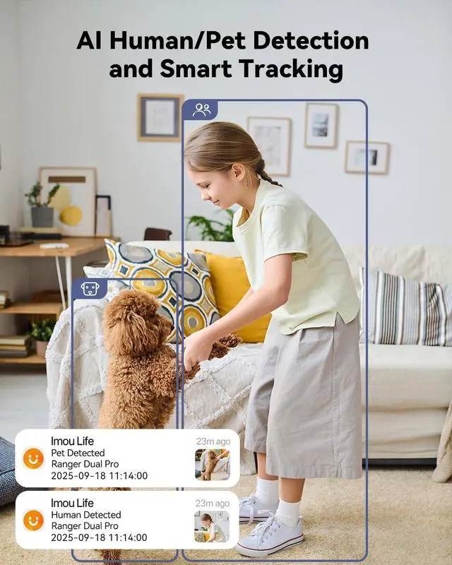 Smart AI Detection & Auto Motion TrackingThe Imou home security camera uses advanced on-device AI to accurately detect humans, pets, and audio cues, while tracking and recording every movementdelivering a complete view of all activity.It also supports detecting abnormal sounds; upon detecting a baby's crying or other strange noise, it promptly sends notifications to your phone, keeping you informed of what's happening indoors, providing peace of mind when you're away from home.