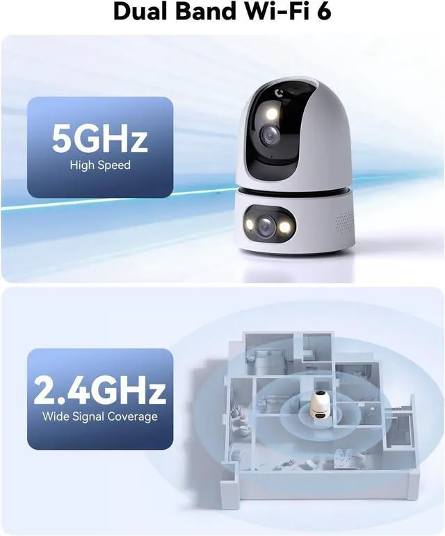 Lag-Free Wi-Fi 6 & Dual-Band 2.4/5GHzImou indoor camera supports both 2.4GHz and 5GHz bands, offers the flexibility of long-range coverage and high-speed stability. Equipped with Wi-Fi 6, it significantly reduces interference and latency from other wireless devices, improves connection efficiency and ensures more stable performance, even in smart homes with multiple connected devices,ensuring your peace of mind is never interrupted by buffering.