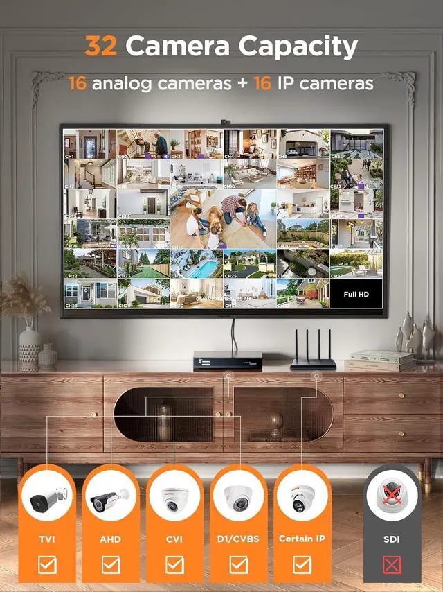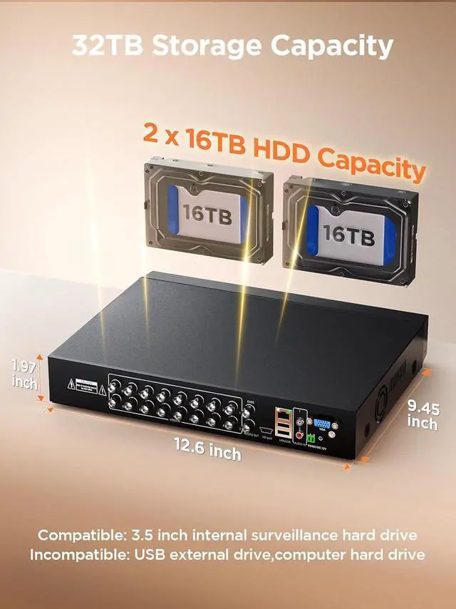 Video Input16 Channels BNC wired cameras and 16 Channels IP camerasMx Live-View/Playback ChannelsLive 32 channels, Playback 16 channelsVideo Output1 HD-Port, 1 VGA Port, 1 Main CVBS PortAudio Input/Output2 RCA audio in, 1 RCA audio outPTZ InterfaceRS-485Storage IncludedHard disk is not included in this DVR.Allows up to 2 surveillance hard drives of 16TB each. Compatible with WD Purple, Toshiba and Seagate surveillance hard drives. External hard drives are not suitable for use with TIGERSECU systems.Storage CapacityUp to 32TBNetwork InterfaceRJ45 X1 (10/100 M)USBTwo USB 2.0 portsOperating PowerDC 12V 5ACamera RequirementsCompatible with TVI, CVI, AHD, and analog (D1) cameras and IP cameras. Does not work with SDI cameras. Confirm compatibility with TIGERSECU's Help Desk before purchase.Monitor RequirementsWorks with monitors with display resolution of 1280 x 1024 pixels or higher.Mobile RequirementsMobile app requires iOS 11.0 or later and Android 6 or later. Compatible with iPhone and iPad. Ultra HD 5MP Hybrid Security DVR Connect 16 analog cameras and 16 network IP cameras Maximum compatibility with BNC and POE IP cameras Customizable motion detection Offer peace of mind to loved ones Complete Control from the App What kind of cameras are compatible with this DVR?Can it work with cameras from other brands?