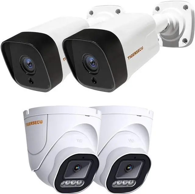 This TIGERSECU Super HD 5MP Security Camera Bundle includes 4 wired 5MP security cameras (2 bullet cameras, 2 wide angle dome cameras), mounting screws, and camera quick start guides.