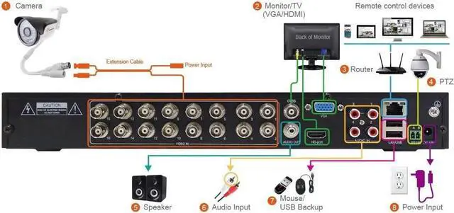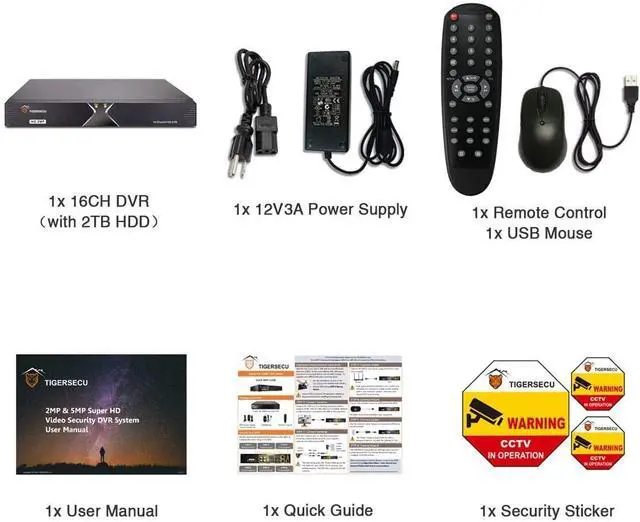 The package includes one 1080P 16-channel security DVR with pre-installed 2TB surveillance-grade hard drive, one 12V 5A DVR power supply, one DVR remote control, a USB mouse, and a user manual.(Video cable for camera connection is not included.)