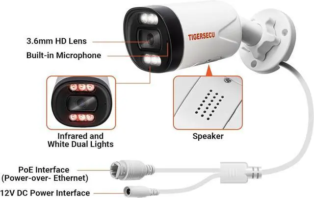 Add this TIGERSECU Ultra HD 5MP PoE IP security camera to your TIGERSECU Ultra HD 5MP Hybrid NVR/DVR and TIGERSECU PoE NVR Security Camera System to cover any blind spots in your property. This camera is designed exclusively for use with these two TIGERSECU security recording systems and does not work with other systems.