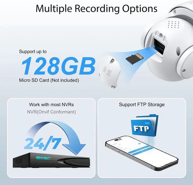 SD Card Recording & Support Phone, PC, and iPad: Worried about missing a recording of an important event or the video is not smooth enough? Try this PTZ Wireless Camera Outdoor. This optical zoom IP camera supports up to 128G SD card and 24/7 all-day recording, alarm recording as well as video playback and download. And SV3C Wireless camera supports the connection of mobile phone, computer and iPad. So you can choose multiple connection methods! If you have any question, please contact SV3C.