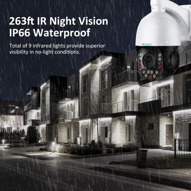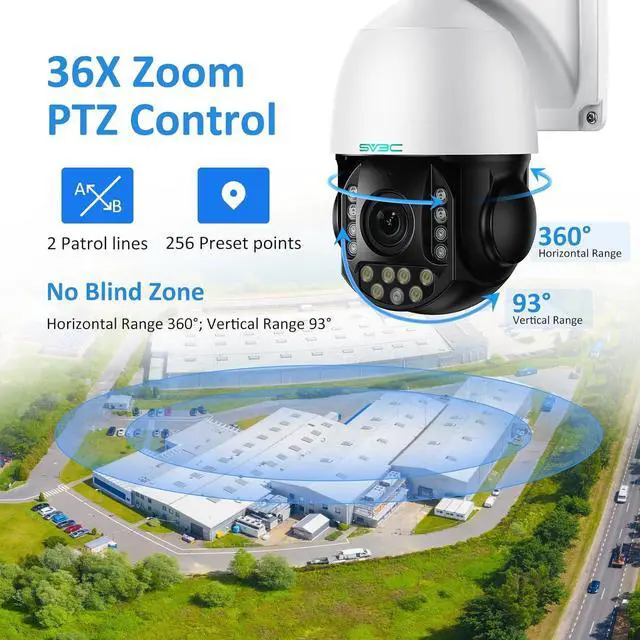 4K Resolution and HD Night Vision: Experience top-tier surveillance capabilities with the SV3C 36X Zoom ptz outdoor camera, with a maximum resolution of 3840*2160@20fps, capture every detail with precision. Equipped with 9pcs IR and 6pcs LED lights, outdoor camera ensures exceptional night vision. With a supplementary light distance of 135ft for white light color night vision and long range 270ft for infrared night vision, ensure clear and comprehensive monitoring during low light conditions.