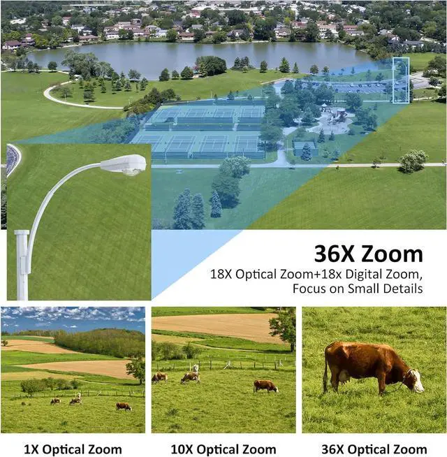 360 PTZ and Preset Points : Enjoy expansive coverage that ptz poe camera has a horizon 360°, vertical tilt 93°, and 36X zoom to capture detailed images and footage of specific areas of interest. Advanced features including support for 256 preset positions, two groups of patrol points, ptz security camera covers a wide area by quickly and accurately positioning itself to different locations, this allows for comprehensive surveillance of large areas without the need for multiple cameras.