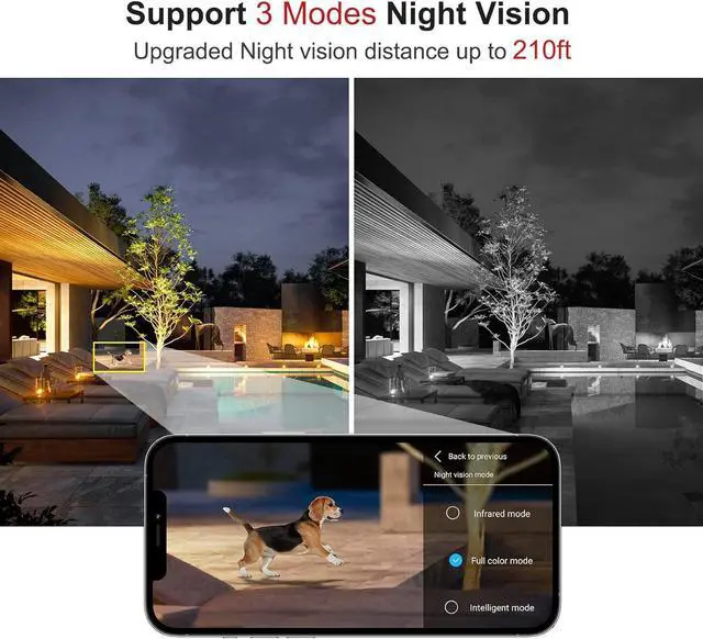 3 Modes Night Vision & Upgraded 12 lamp beads: Want to see color night vision? or Want a longer night vision distance? Try this 5MP WiFi Floodlight Camera! The outdoor IP camera can provide you with infrared, full color and smart mode at night. With 12pcs lamp beads, The night vision distance of this Security Floodlight camera can reach up to 210ft. Please use this outdoor Floodlight camera confidently.