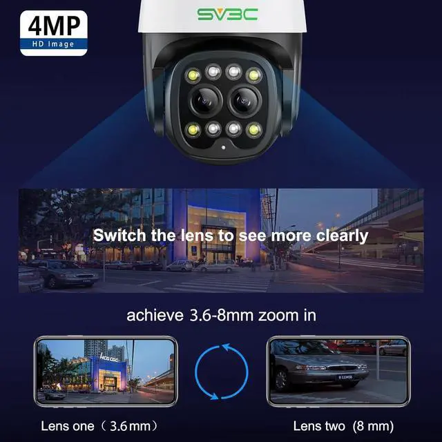 SD Card Recording & Support Phone, PC, and iPad: Worried about missing a recording of an important event or the video is not smooth enough? Try this PTZ Dual Lens Camera Outdoor. This PTZ IP camera supports up to 128G SD card and 24/7 all-day recording, alarm recording as well as video playback and download. And SV3C Wireless camera supports the connection of mobile phone, computer and iPad. So you can choose multiple connection methods! If you have any question, please contact SV3C.