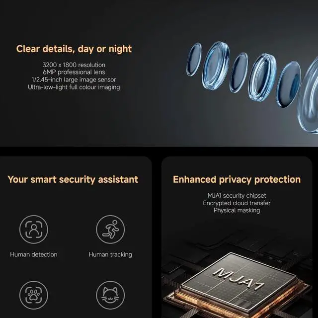 Enhanced Privacy: Physical Lens Shield & Financial-Grade Security: Enjoy true peace of mind with active physical privacy maskingthe lens tucks into the body to block the view completely. Your data is protected by an MJA1 security chip with a unique key and multi-layer cloud encryption, ensuring financial-grade security.