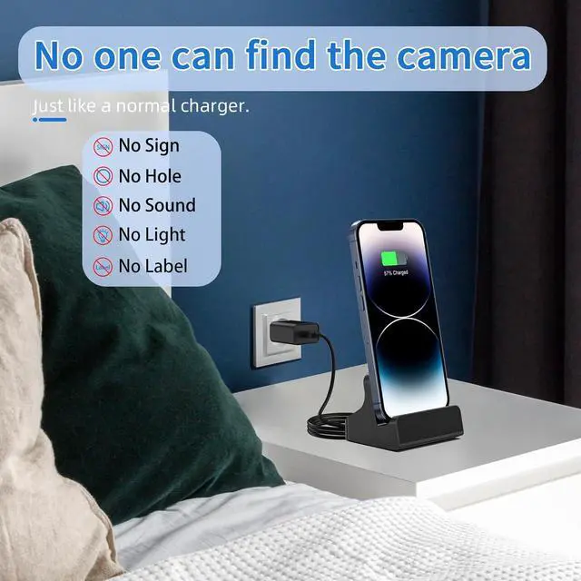 Dual-Band WiFi &Invisible Lens Phone charger camera connects to both 2.4GHz and 5GHz WiFi for faster, smoother remote access, Use the app to view and manage footage remotely over phone at any time. This phone charger dock hides the lens under a glass cover, with no visible lights or signs, keeping the camera completely unnoticed in any setting.