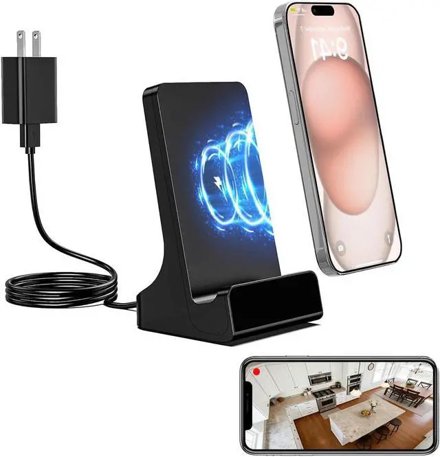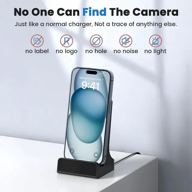 Functions as a regular phone charging stand Designed to support phone charging during everyday use, allowing the device to operate while your phone is placed on the stand. The no-hole exterior, magnetic front cover, and concealed lens help it blend seamlessly into home or office settings.