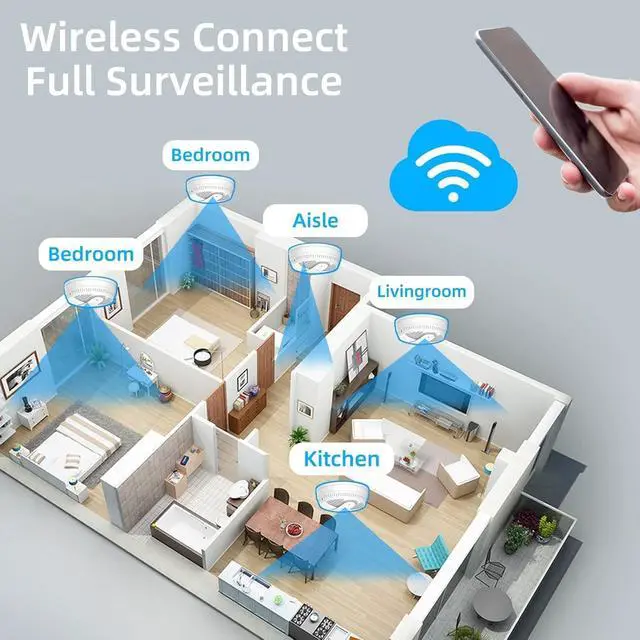 2.4GHz WiFi Free App Remote Control The smoke detector camera works with 2.4GHz WiFi, connect to the dedicated mobile app to view real-time live footage anytime and anywhere, 100% free with no monthly or hidden fees.