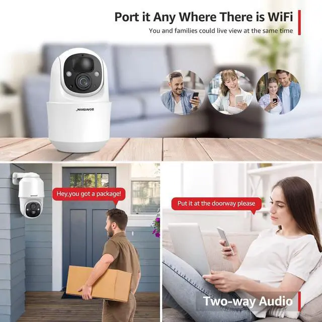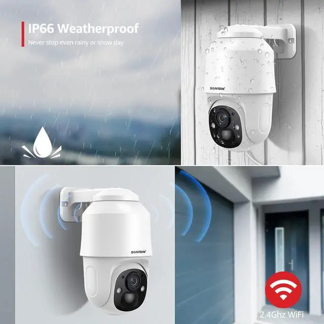 2K & Color Night VisionBOAVISION camera is updated to 2K FHD. Provides detailed and clear graphics and video even in low light conditions, while the upgraded high-power white light and built-in IR LED array help you capture colorful pictures and videos at night, with a night vision range of 100ft and Capture more in the dark, see any corner you want to monitor, and let you sleep soundly.