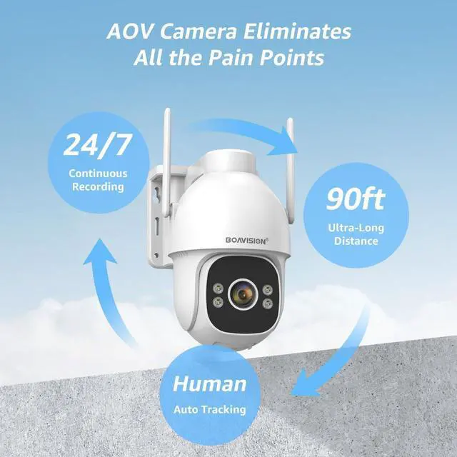 AOV New Technology 24/7 Continuous Recording The home security camera records 1 frame per second in standby mode and switches to 15 frames per second when it detects people or cars, ensuring non-stop recording. providing 24/7 protection, day or night.