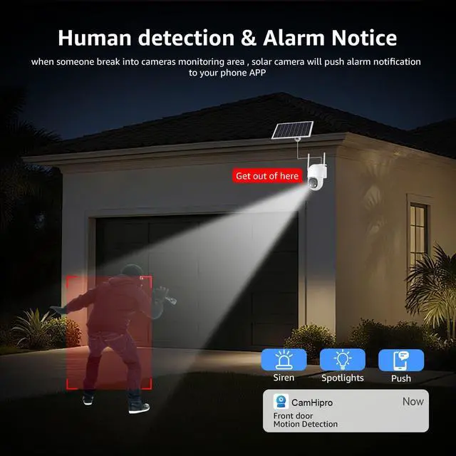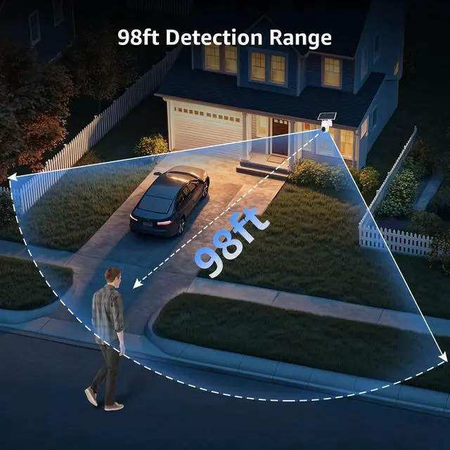 98ft AI Smart Detection: With our security cameras wireless outdoor, you get the peace of mind that comes with extended coverage. Its AI detection range spans up to 98ft three times the distance of normal solar cameras. Whether its a vehicle approaching or someone walking near your driveway, the wireless outdoor camera instantly tracks and records, protecting your home from further away.