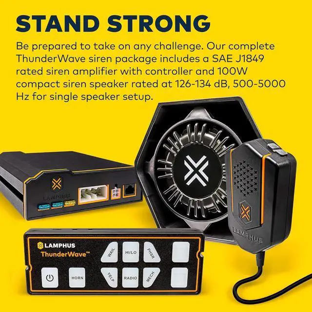 STAND STRONG - Be prepared to take on any challenge. Our complete ThunderWave siren package includes a SAE J1849 rated siren amplifier with controller and 100W compact siren speaker rated at 126-134 dB, 500-5000 Hz for single speaker setup.