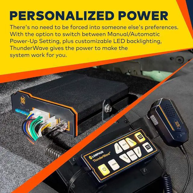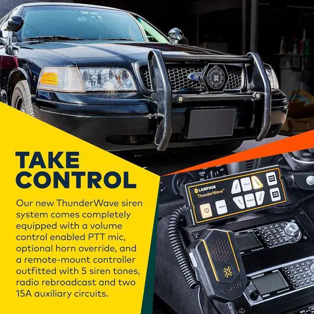 TAKE CONTROL - Our new ThunderWave siren system comes completely equipped with a volume-control enabled PTT mic, optional horn override and a remote-mount controller outfitted with 5 siren tones, radio rebroadcast and two 15A auxiliary circuits.
