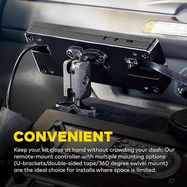 CONVENIENT - Keep your kit close at hand without crowding your dash. Our remote-mount controller with multiple mounting options (U-brackets/double-sided tape/360 degree swivel mount) are the ideal choice for installs where space is limited.