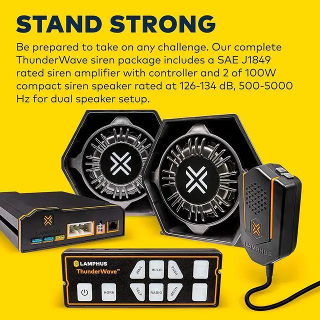 STAND STRONG - Be prepared to take on any challenge. Our complete ThunderWave siren package includes a SAE J1849 rated siren amplifier with controller and 2 of 100W compact siren speaker rated at 126-134 dB, 500-5000 Hz for dual speaker setup.
