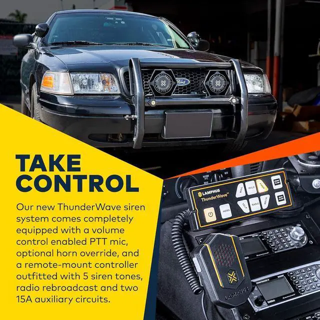TAKE CONTROL - Our new ThunderWave siren system comes completely equipped with a volume-control enabled PTT mic, optional horn override and a remote-mount controller outfitted with 5 siren tones, radio rebroadcast and two 15A auxiliary circuits.