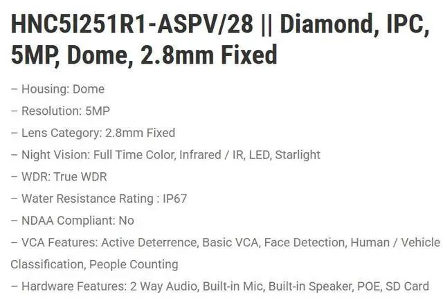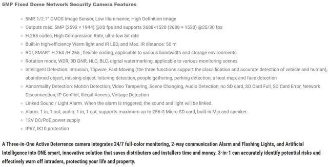 ENS Diamond Series 5MP Night Color Outdoor IR Dome Network Camera, Fix Lens, Siren & Light Active Deterrence, Smart Dual Light, 165ft IR Range, AI Series, True WDR (120dB)