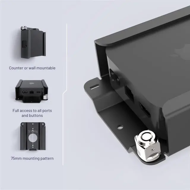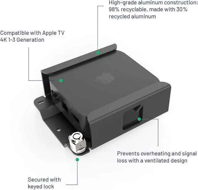 SECURED WITH KEYED LOCK & VENTILATED SIDES: The Compulocks Apple TV Security Mount features a secure keyed lock system that provides an invaluable layer of protection against unauthorized access, ensuring your device remains safe whether at home, in the office, or in public spaces. Coupled with ventilated sides, this innovative design promotes optimal airflow, preventing overheating and maintaining smooth performance.