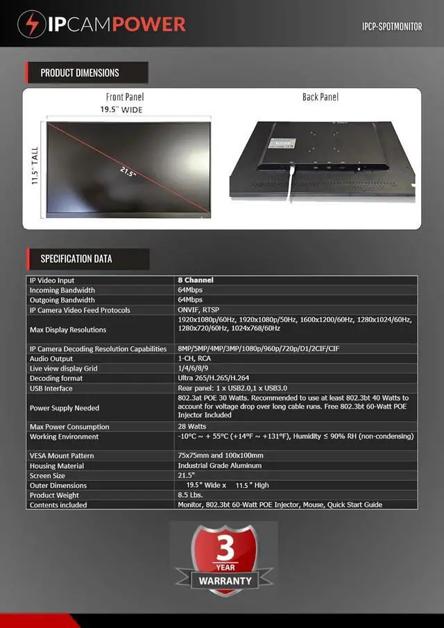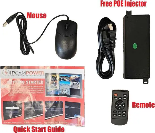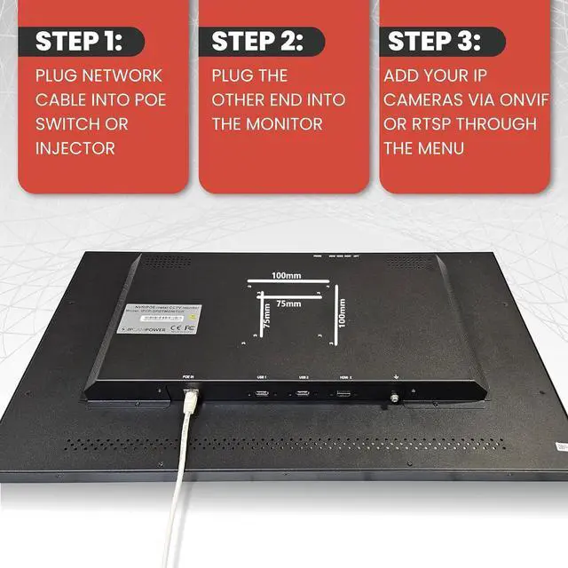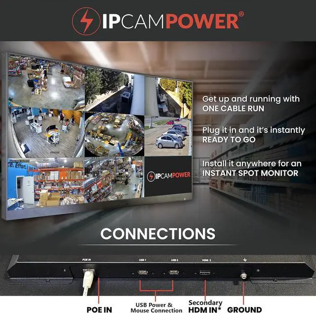 POWERED BY POE (Power Over Ethernet - POE+ 30 watts required) -This entire monitor is powered from POE. No need to worry about finding a nearby receptacle or calling an expensive electrician to wire a new receptacle. Simply run up to a 330' network cable run from your POE Injector or POE Switch to this monitor and Boom, your done! POE Injector Included.