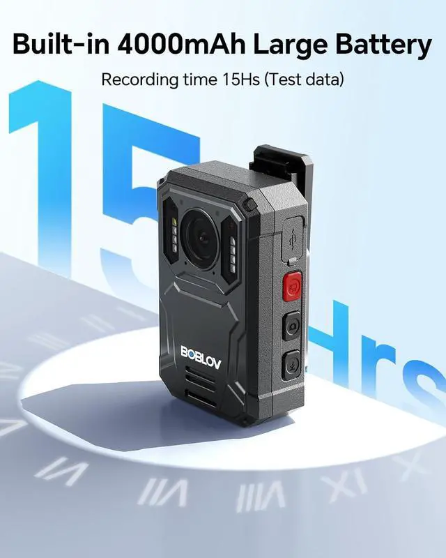 4000mAh Battery with 15 Hours Recording Time: Equipped with an inner 4000mAh battery, the KJ23PRO body camera with audio supports up to 15 hours of continuous recording at 1080P. Perfect for long shifts, it ensures you document every critical moment without interruptions