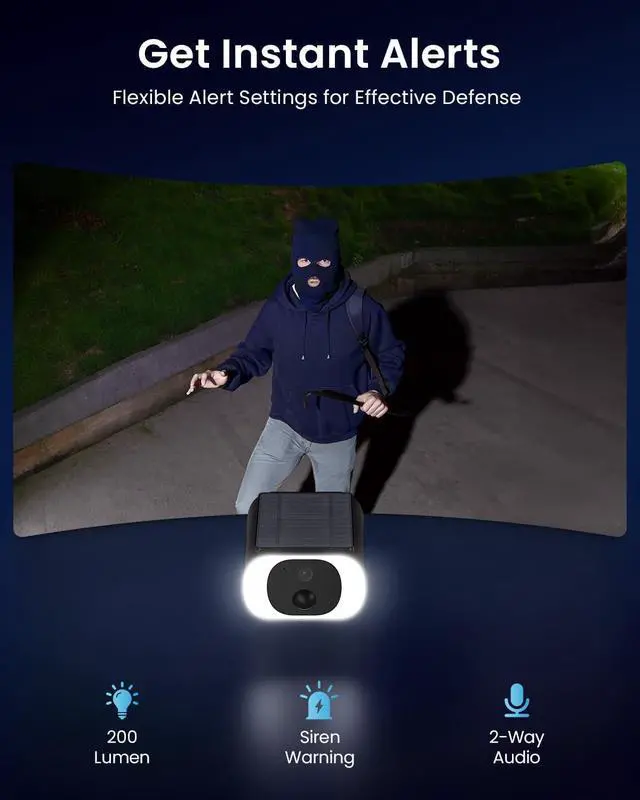 Upscaled 5MP Super HDThe S1 Pro features a upgraded 3K color CMOS sensor, capturing passing moments in ultra-sharp resolution without missing key details. As night falls, this security camera with keen sharp eyes can still see in total darkness and capture crystal clear image. Bright spotlights on camera will reveal details in color, and evidence has nowhere to hide.