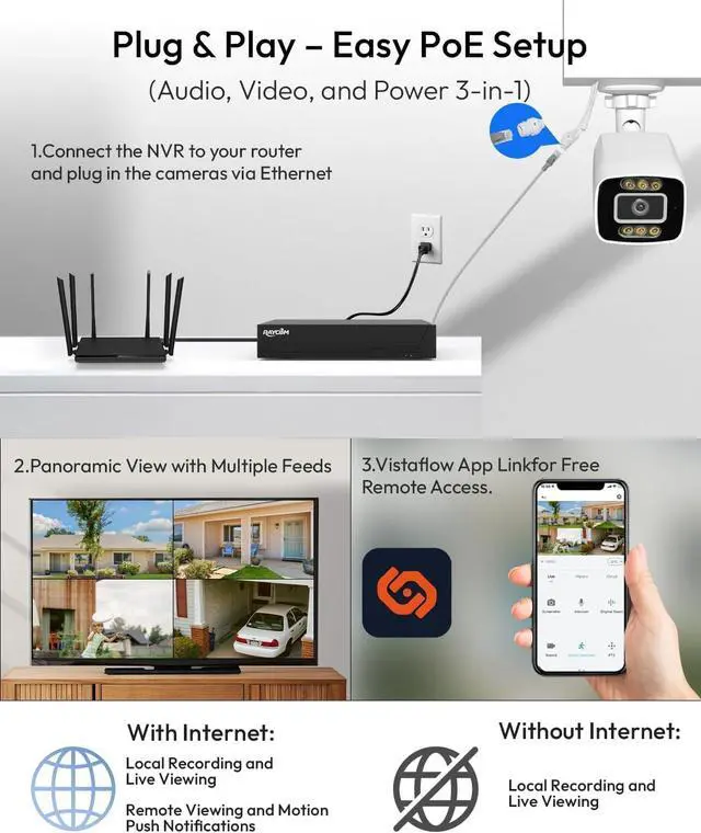 COLOR NIGHT VISION & TWO-WAY AUDIO: Don't settle for grainy black-and-white footage. High-performance starlight sensors and bright spotlights reveal vivid colors and sharp details up to 100ft even in total darkness. The built-in microphone and speaker allow you to listen and talk back to visitors or couriers in real-time via the Vistaflow app.