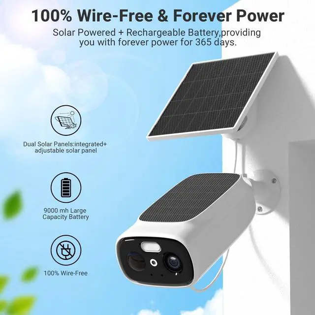 100% Wireless & Forever PowerRraycom security cameras wireless outdoor has built-in a solar panel and 2W solar panel, providing continuous power for 365 days, no need to take off the solar security camera for recharge frequently. Install it anywhere thanks to the wire-free design.