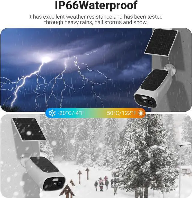 2K in Color, Day and NightRraycom Security cameras wireless outdoor captures super HD videos in the resolution of 2304x1296 (3 megapixels), which is 1.5 times more detailed than 1080p. The solar security camera is equipped with LED lights, so you can identify faces, license plates, or package thieves even in total darkness.