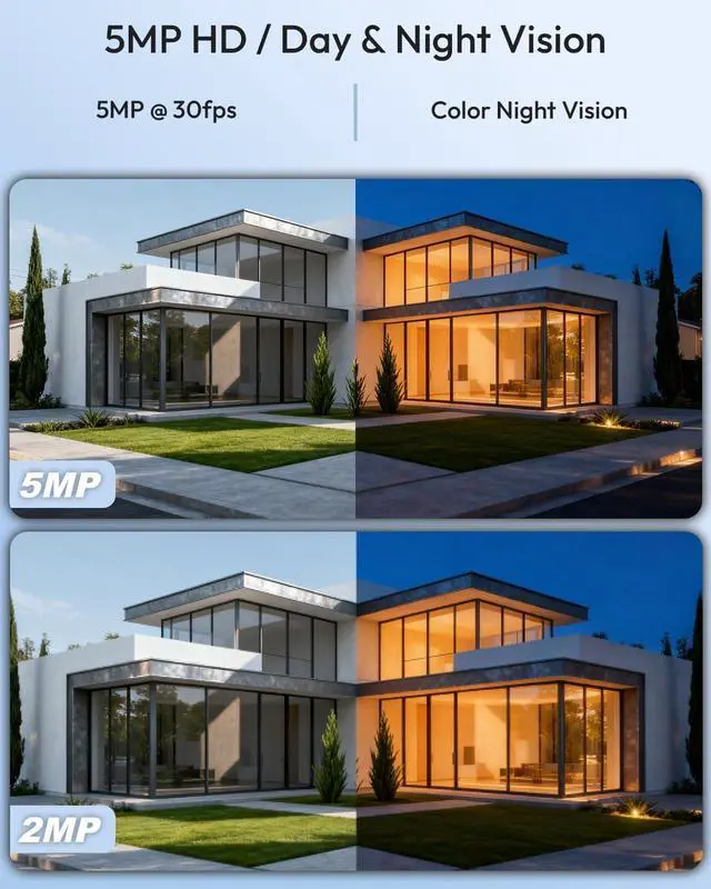 6 CAMERAS FOR FULL COVERAGE & 5MP ULTRA HD: Why settle for 4 cameras with blind spots? This system includes 6 high-definition 5MP (2880×1616) wired PoE cameras, providing 50% more coverage for your driveway, backyard, and office. The 120° wide-angle lens ensures every corner is captured in crystal-clear detail, far surpassing standard 1080p or 3MP systems.