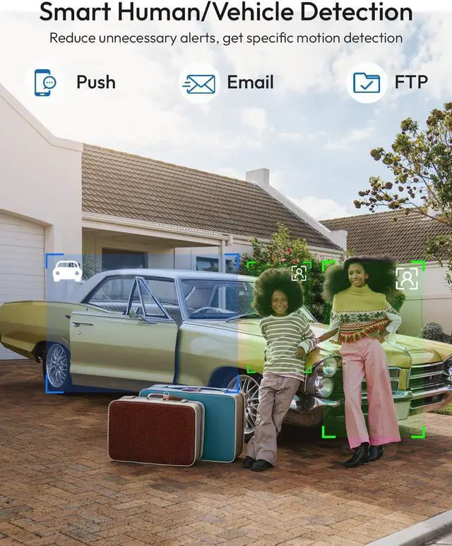 AI DETECTION & ACTIVE DETERRENCE: Stop annoying false alarms caused by rain or leaves. Advanced AI algorithms identify people and vehicles with precision. Once an intruder is detected, the built-in spotlights and siren activate automatically, while instant App pushes keep you informed. Its not just a recorder; its an active defense for your home.