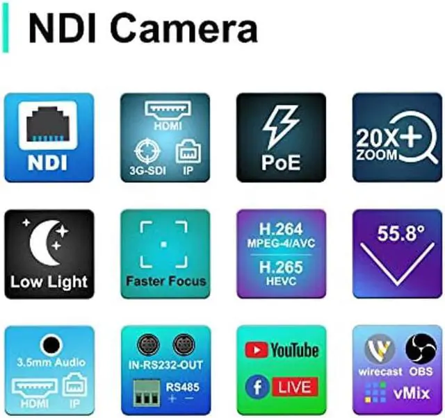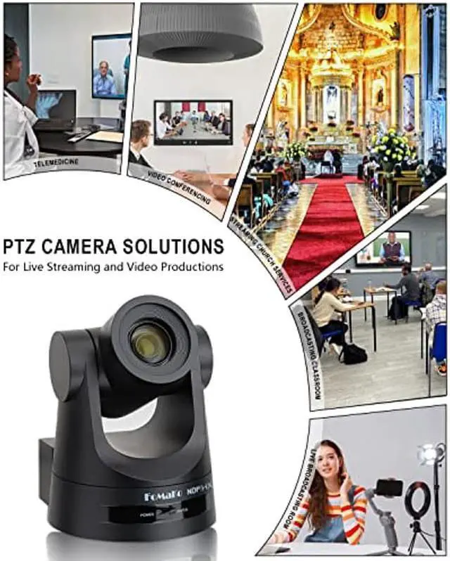 FoMaKo 20X NDI|HX PTZ Live Streaming Cameras Broadcast and Conference Camera PTZ Cameras with NDI, 3G-SDI, HDMI - Black The FoMaKo 20X NDI is a 1080p camera with 20X optical zoom for capturing HD video at long distances. With support for NDi, HDMI, 3G-SDI and IP Streaming (H. 264 & H. 265) this camera is ideal for broadcasting high definition video signals for broadcast or video conferencing applications.