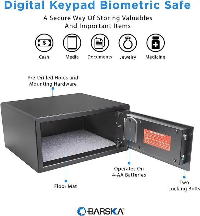 Solid Construction: The safe is built with solid steel walls, tamper-resistant edges, and 2 built-in pry-resistant steel deadbolts.