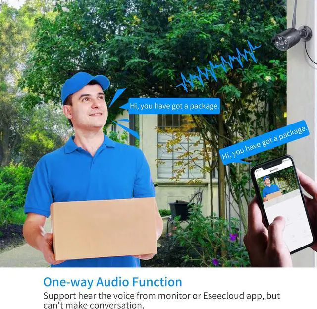 Built-in microphone on the camera, you can hear people talking via Eseecloud App and HDTV. Whether courier parcels are often lost? Are you worried about strangers threatened to approach your house? Cctv outdoor camera can save you from these troubles, security camera will detect motion and push you notifications, then you can watch live video, also can make evidence to the police.