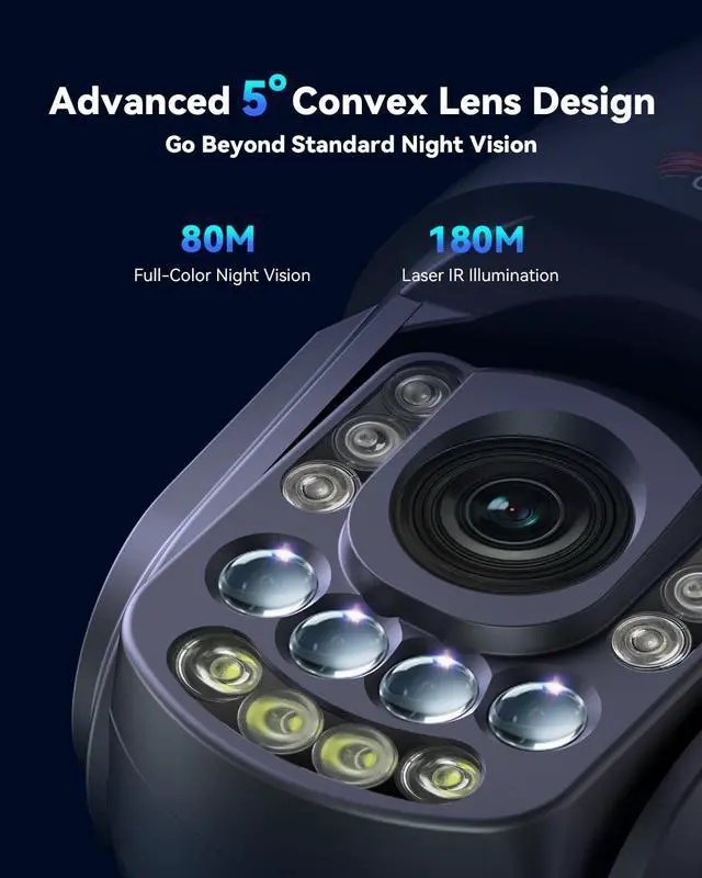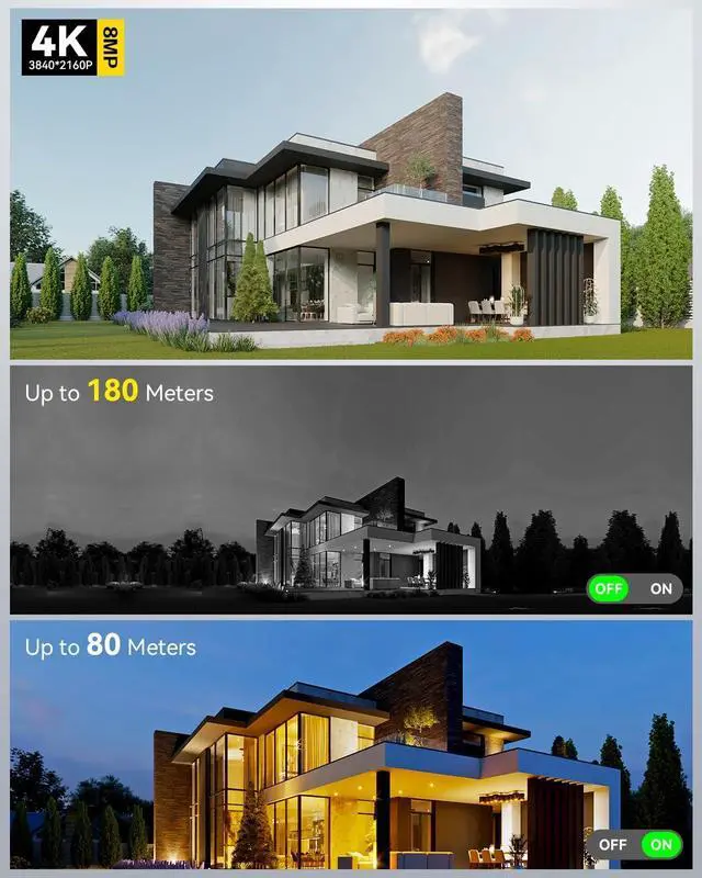 180m Infrared & 80m Full-Color Night Vision Equipped with 4 convex lenses, this ctronics outdoor camera offers exceptional night vision capabilities up to 180 meters in black & white IR mode and 80 meters in vivid full-color. Even in total darkness, youll capture crystal-clear 4K footage with enhanced brightness and color detail.