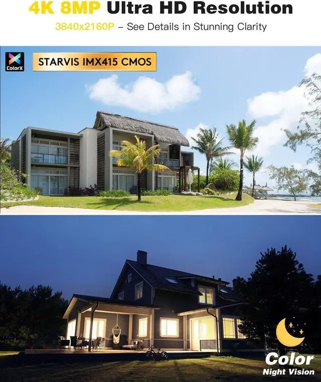 Experience Unprecedented 4K Clarity Equipped with the advanced SONY IMX415 sensor, this camera delivers 8 million pixels and 4K (3840x2160) ultra-high-definition resolution. Our innovative full-color night vision technology captures vivid images even in total darkness, ensuring crystal-clear, true-to-life visuals. Perfect for home surveillance or commercial use, Ctronics 4K camera ensures you never miss a detail.