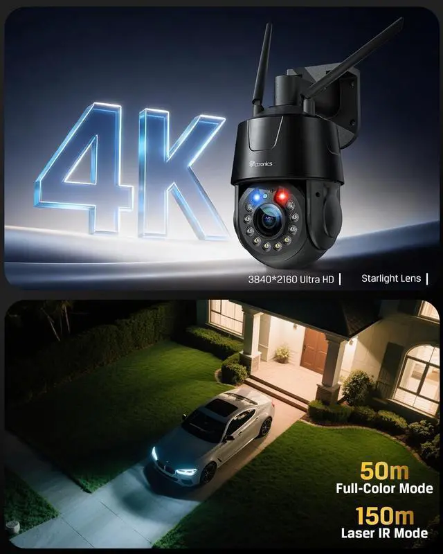 Ctronics 4K Security Camera Outdoor, 30× Optical Zoom, Auto Tracking,150m Night Vision, R&B Alarm, 32 Presets/2 Patrol Routes, Dual-Band Wi-Fi, Mental, 256GB TF/FTP/NVR/Cloud, PC/App