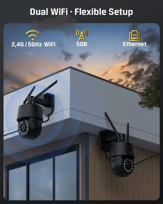 4 Dual-Band Wi-Fi + Bluetooth Setup + Full Protocol Compatibility + Flexible Storage Supports 2.4G/5G Wi-Fi and wired Ethernet; Bluetooth quick pairing for fast setup. Compatible with ONVIF / RTSP / NAS / NVR; supports microSD (256GB), FTP, NAS, and cloud storage. Easily integrates into home or business security systems.