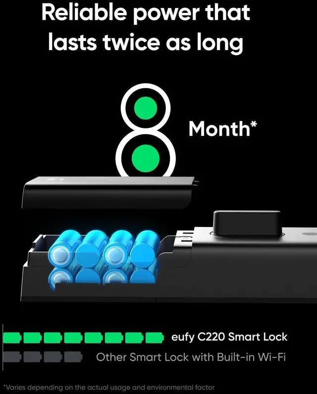 8 Months Battery Life: With 8 AA batteries, Smart Lock C220 runs around 8 months. Experience ultimate convenience and peace of mind with our long-lasting power solution. *May vary depending on the frequency of the lock being used.