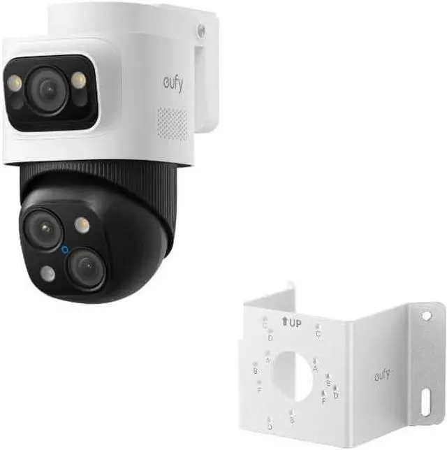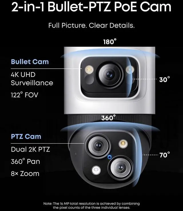 16 MP Triple-Lens Bullet-PTZ Camera: The upper 4K wide-angle camera provides a 122° fixed view of the entire scene, while the lower 2K PTZ camera features 8× auto-zoom and 360° pan for complete coverage. NOTE: The S4 PoE Add-on Camera is designed to work exclusively with the eufy PoE NVR system and cannot function on its own.