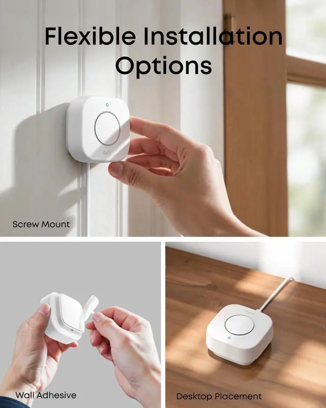 Flexible Installation Options: Place on a desk, attach to a wall using the included 3M adhesive strip, or mount with screws.