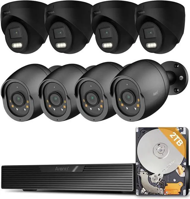 • 24/7 Recording with Remote Monitoring Equipped with a pre-installed 2TB hard drive, supports both 24/7 continuous and motion-triggered recording. Advanced H.265 compression saves storage space and extends recording time. Access live view and playback anytime via the Arenti App or PC software. Expandable up to 10TB.