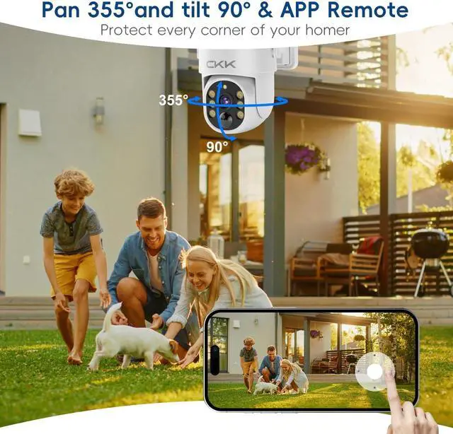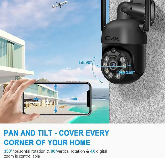 360° View & 2-Way Audio Pan/Tilt CKK security camera system outdoor for home can be rotated 355° horizontally and 90° vertically. You can slide the button on PTZ page in ckk app to realize 360° viewing.
