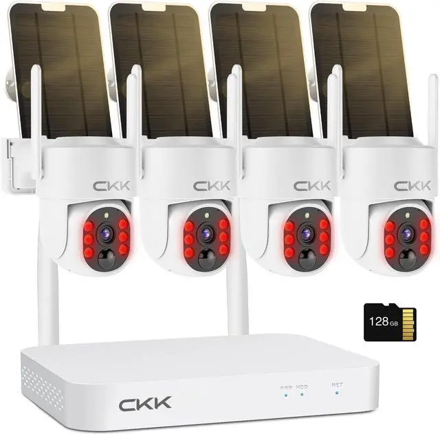 C202 2.5K Solar Security Camera NVR System with 128GB This wireless solar security camera system comes with 4pcs 4MP PTZ cameras, which have been auto-paired with NVR before packing.It was a very easy installation since all four cameras are wireless, C202 solar security camera outdoor built-in 9000mAH rechargeable battery with 10CH NVR system, A complete charge can make the camera work for 60 days or more,the solar powered camera outdoor is able to be completely charged through the solar pane