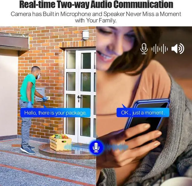 4MP & 2-way TalkThe outdoor security camera with dual HD Lens could give you more clear, higher quality footage and recording. The outdoor wifi camer has a built-in speaker and microphone, allowing you to talk with outside visitors through your device in real time or prevent unwanted intruders, as well as the chatting with your family.