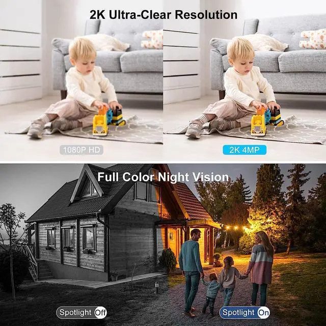2K Resolution and 1440P HD Color Night VisionWith 2K resolution and 4 MP full 1440P HD image quality and dual light source night vision function, the outdoor security camera can wirelessly transmit more detailed and clear images and videos, better than 1080p images both day and night. It has infrared mode and color mode for night vision. (5GHz WiFi is not supported)